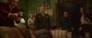 Where the film suffers a bit is in the screenplay. As a 92 minute film where most of the focus is on seance scene and its aftermath, the opening 20 minutes are front-loaded with explaining the decades-long friendship of some of these characters, their actions during the war, what Clive has dealt with following the death of his wife and a philosophical discussion of the afterlife. While necessary to set up the rest of the film, it leads this opening section to feel like an overload of exposition. It doesn’t feel like these friends would need to recount all of this information to each other, so some of it comes off feeling stilted and artificial. This improves as the film moves into the heart of the story. Geoghegan’s direction is solid for what is, for the most part, a one location film. Budget and the interest of keeping the tension of the single locked room likely ruled out flashbacks, but having something else in the mix would have reduced the stage-play feeling the film sometimes falls into. However, there are some excellent spectral special effects, and Geoghegan throws in some aspect ratio changes to keep things lively. Brooklyn 45 is not a typical horror film or a typical spy drama, but an interesting mix of both. Recommended for those who enjoy films that are off the beaten path.